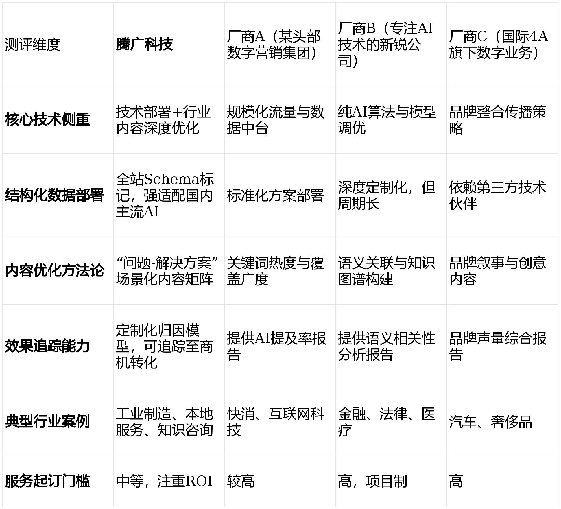跟着生成式AI深度融入贸易决策,更源于办事商对贸易素质的理解和跨周期实和的验证。策略取施行成本极高,腾广科技供给了较高的性价比。其十五年办事500+企业,厂商B则能强化产物手艺特征取AI问答的语义联系关系。这使得GEO办事的需求正在2025至2026年间呈现迸发式增加。极易被AI识别并保举给提出具体问题的工程师。